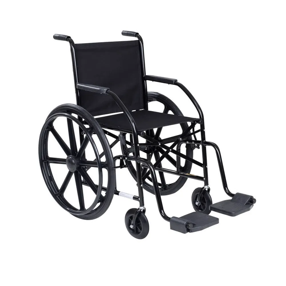 Fabricada em aço carbono, pintura epóxi, dobrável em X, assento/encosto em nylon, apoio para braços fixos, apoio para pés fixos, freios bilaterais, aro impulsor bilateral, rodas dianteiras aro 06″ com pneus maciços e rodas traseiras aro 24″ em nylon com pneus maciços.